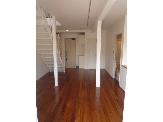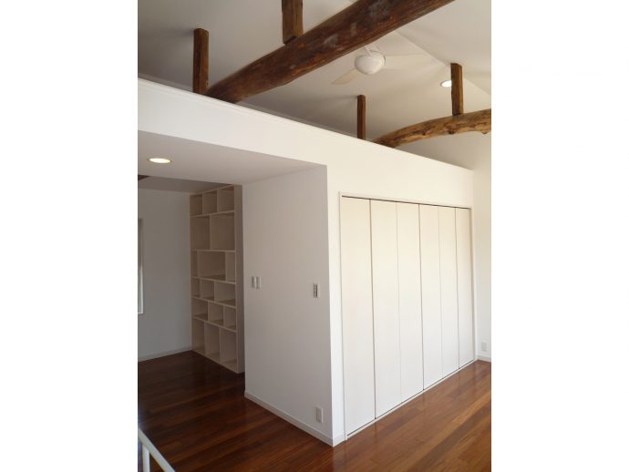 お二人共にシンプルな白色の空間を好まれ、壁紙やキッチン等全体を白で統一し、アクセントとして既存の梁材を現しにしました。