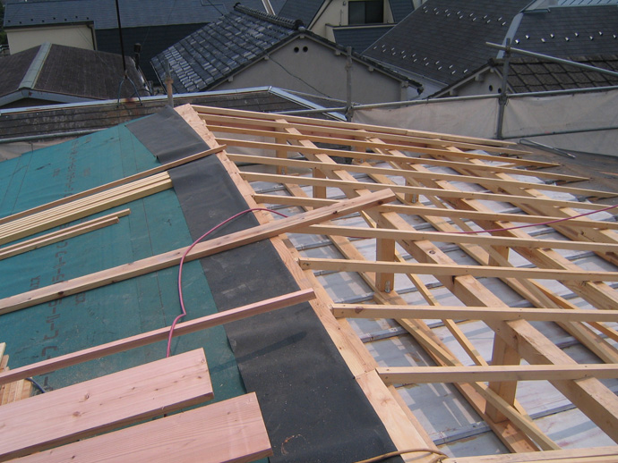 屋根裏換気と防水性を考慮して屋根勾配を作り、新たにガルバリウム鋼板に葺き替えました。